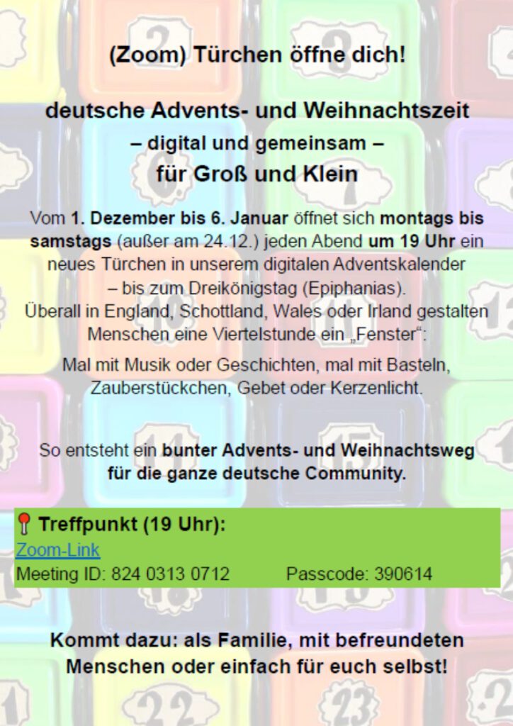An fast jedem Freitag öffnet sich um 19 Uhr ein online ZOOM-Kalendertürchen mit Themen, Geschichten und Musik passend zum Kirchenjahr und zur Jahreszeit.